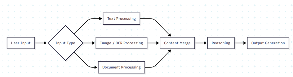 Figure 2: Multimodal orchestration flow combining text reasoning, image understanding, OCR extraction, and output synthesis.