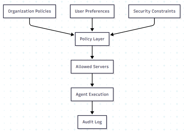 To preserve governance, administrators can pin mandatory servers, define deny lists, and enforce organization-level constraints. This keeps human control over selection behavior while improving tool relevance and reducing unnecessary execution overhead.