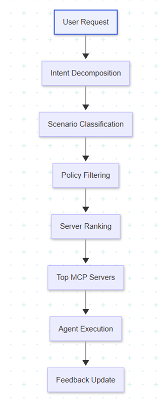 Candidate servers are ranked using a weighted policy that combines relevance, historical success rate, response latency, and security-scope fit. Only top-ranked and policy-compliant servers are exposed to the acting agent. Post-execution scoring updates ranking priors for similar future contexts, enabling adaptive optimization with full auditability.