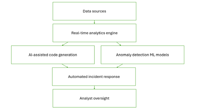 On top of this high-performance data layer, the system introduces AI-assisted code generation. Instead of writing detection logic manually, an analyst formulates requirements in plain English. For example: “Detect any user who logs in from two countries within five minutes, combined with more than three failed login attempts in the same period.” The AI engine translates this request into an executable Spark SQL query or SIEM detection script, optimizes it for performance, and injects it into the live pipeline. What previously took hours of manual scripting and debugging is now produced in seconds.